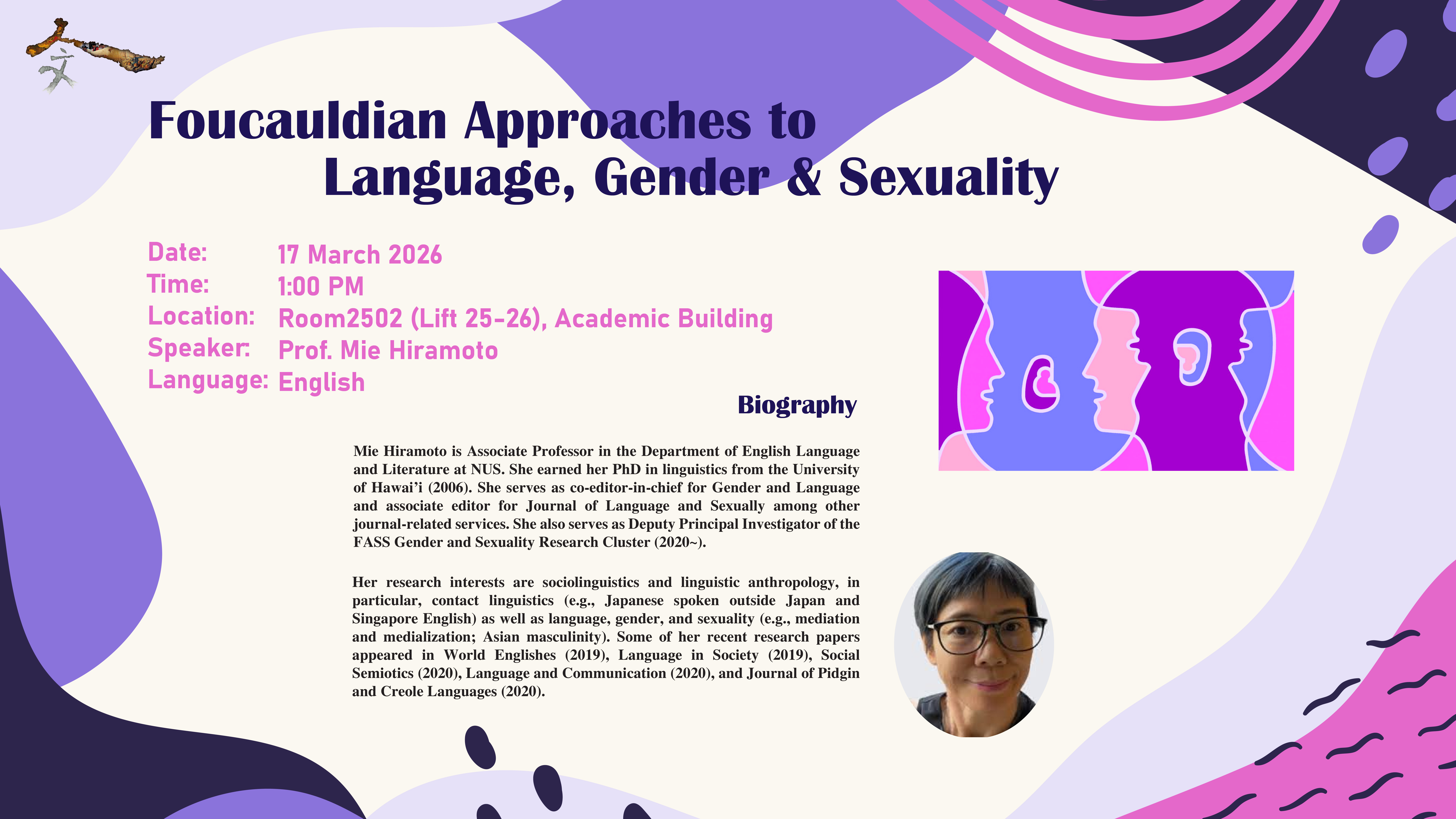 Mie Hiramoto is Associate Professor in the Department of English Language and Literature at NUS. She earned her PhD in linguistics from the University of Hawai’i (2006). She serves as co-editor-in-chief for Gender and Language and associate editor for Journal of Language and Sexuality among other journal-related services. She also serves as Deputy Principal Investigator of the FASS Gender and Sexuality Research Cluster (2020~).